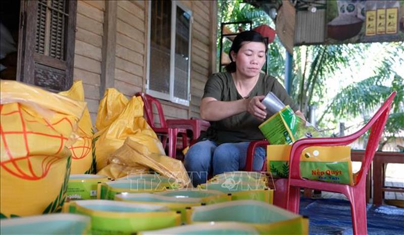 Người dân xã An Nhơn đóng gói sản phẩm gạo Nếp Quýt Đạ Tẻh chuẩn bị cho thị trường Tết Nguyên đán 2021